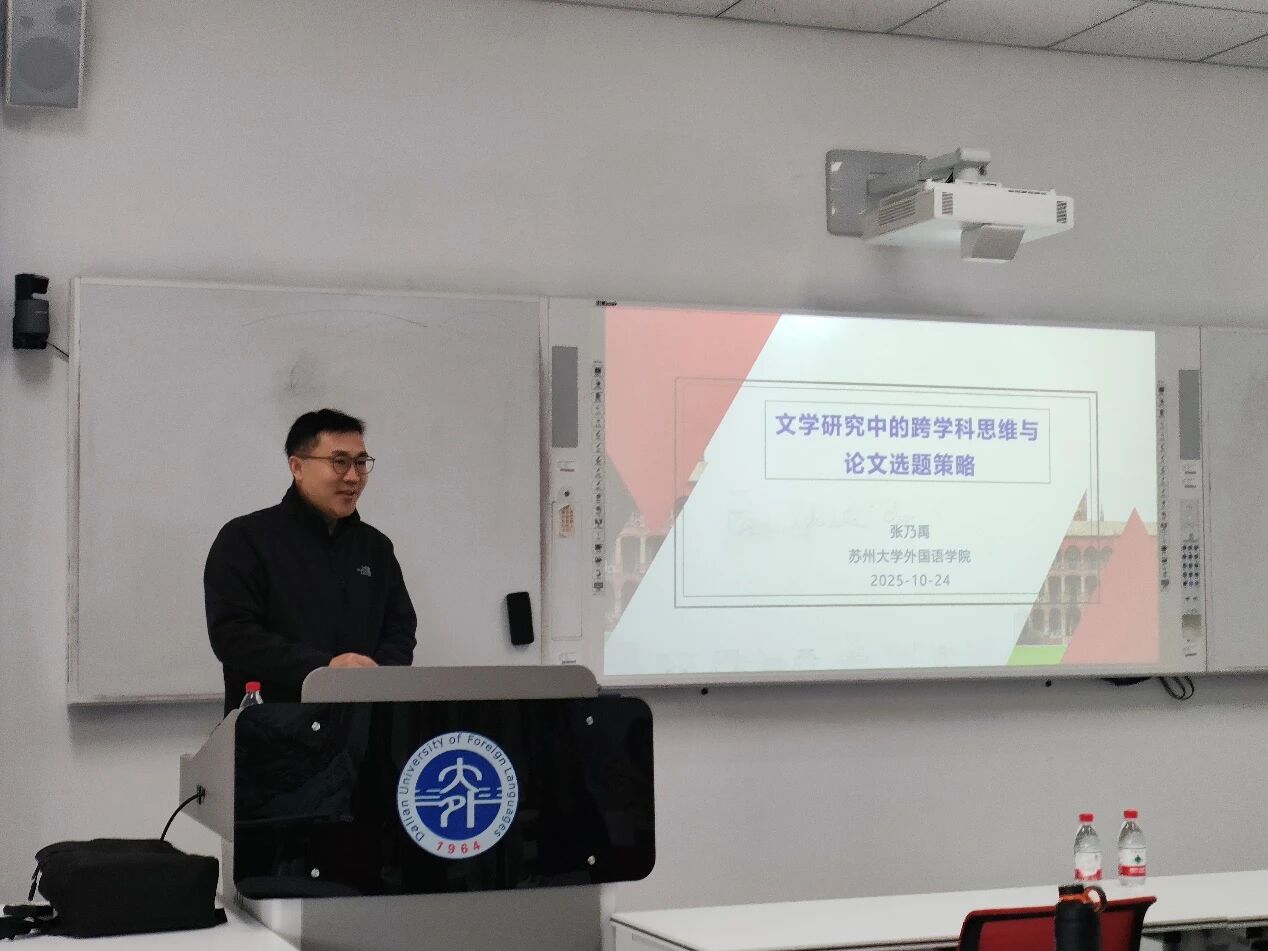 2025年10月24日上午,研究生03级校友,苏州大学韩国学研究所所长、博士生导师张乃禹教授应邀重返母校大连外国语大学,在8B405教室为韩国语学院研究生作了“文学研究中的跨学科思维与论文选题策略”专题讲座。本次讲座由马丽副院长主持,并邀请张教授硕士期间的导师任晓丽教授参与交流,2025级全体研究生参与了此次活动。