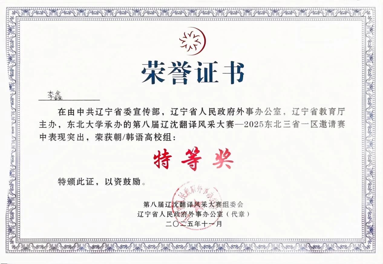 本次大赛分为初赛和决赛两个阶段。初赛以线上提交演讲视频形式进行,主题围绕“从老工业基地到新时代振兴——我的东北记忆”和“用外语讲述中国故事——我是中国文化的传播者”展开。赛事设机关、高校、留学生3个组别,覆盖英语、日语、朝/韩语、俄语等多个语种,吸引了东北三省一区479名选手报名参加。经过专家评审,我院朝鲜语口译专业2024级研究生李鑫、李盈萱两位同学脱颖而出,晋级决赛。